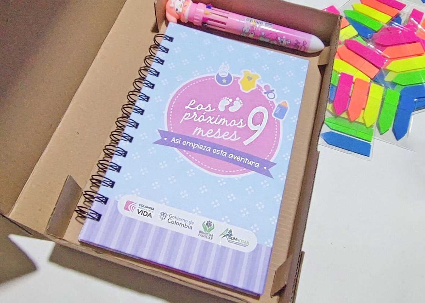 Cada agenda, presentada en una cajita de cartón con el adhesivo “Así empieza esta hermosa aventura en Familia”, incluye un lapicero multicolor y se convierte en una herramienta clave para el registro de controles médicos, citas, síntomas, antojos y emociones.